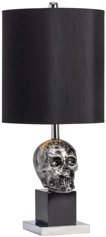 Every day can be Halloween when you add the Crestview Collection Black Skull Table Lamp to your space. Its modern style oozes with personality from the square black pedestal with silver metal-finished base to the chrome finish skull just below the lamp pillar.Read More