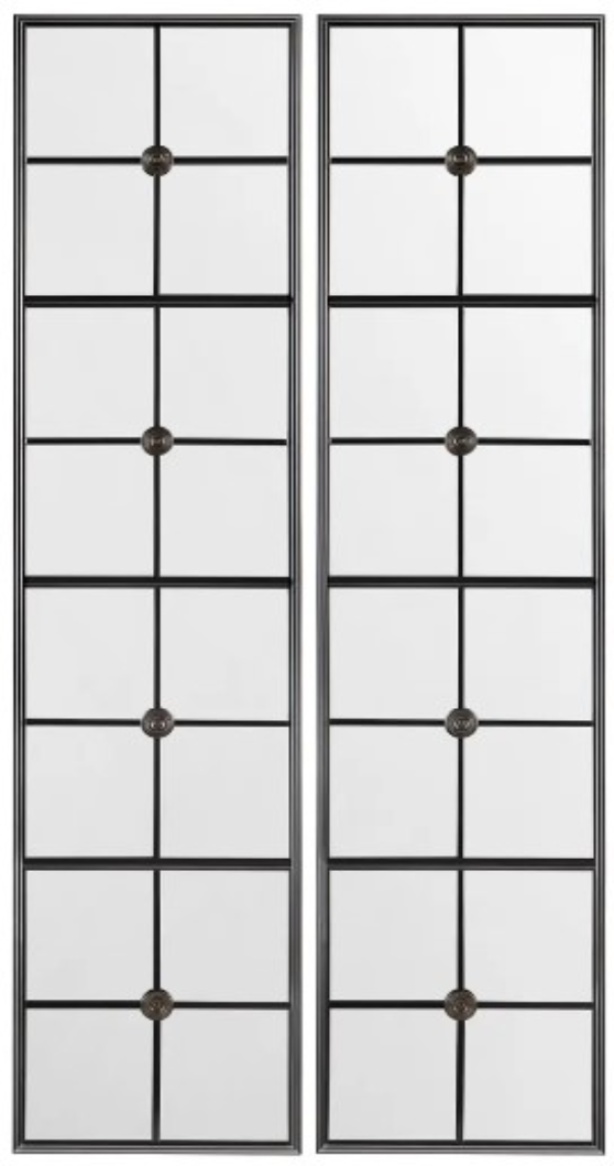 Crafted from high-quality metal, these mirrors feature a sleek and modern design that will complement any interior style. The black finish adds a touch of elegance, making them perfect for any decor theme. The round detailed embellishments down the middle of the mirrors create a charming touch of sophistication that is sure to delight any guest. These mirrors are not just a functional piece, but they're also a statement piece that will enhance the visual appeal of your interior. Hang them together in a cluster for a bold and eye-catching display or spread them out in different rooms to add depth and dimension.