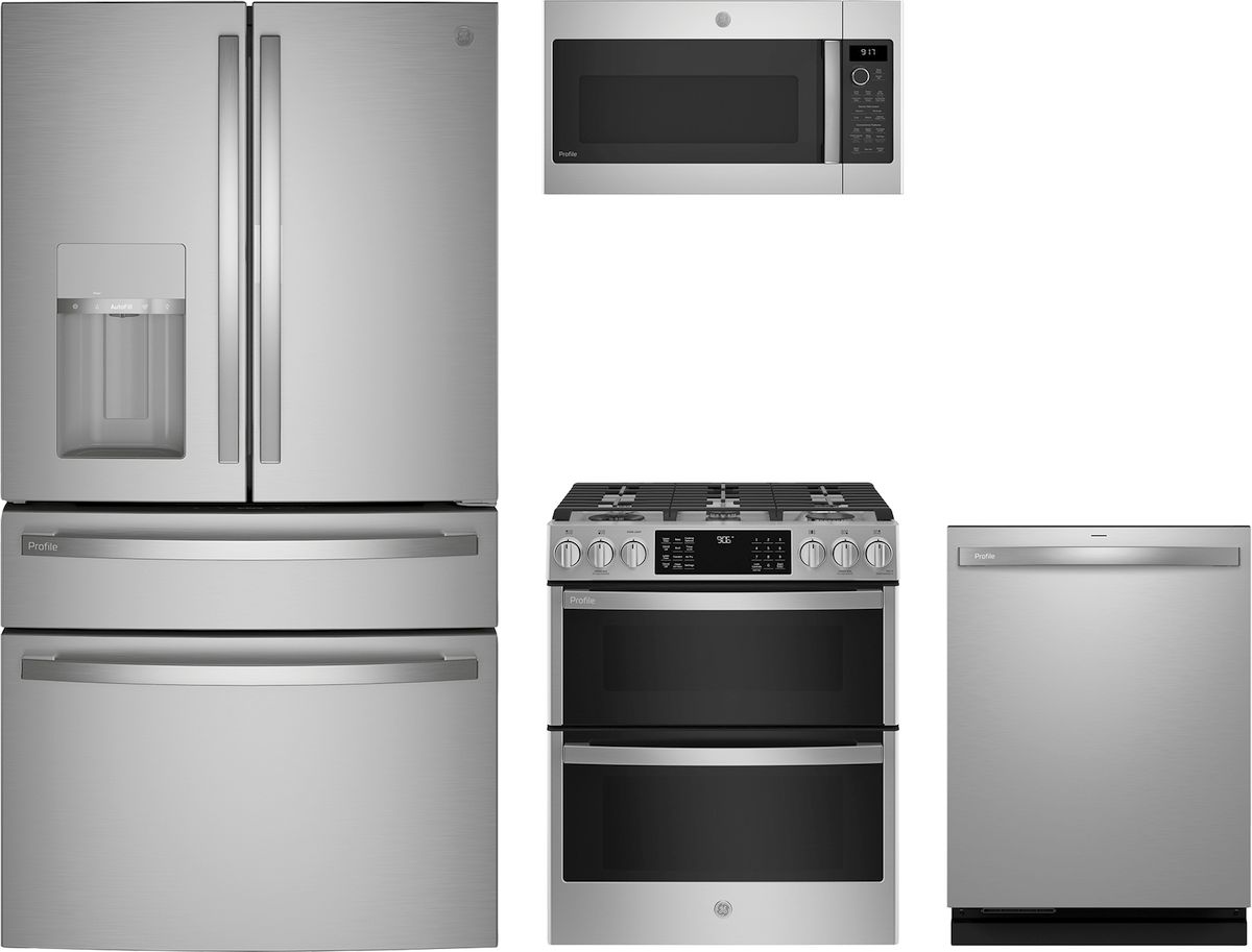 GE Profile™ 4 Piece Stainless Steel Kitchen Package with a French door refrigerator, slide-in gas range, built in dishwasher and over the range microwave.Read More