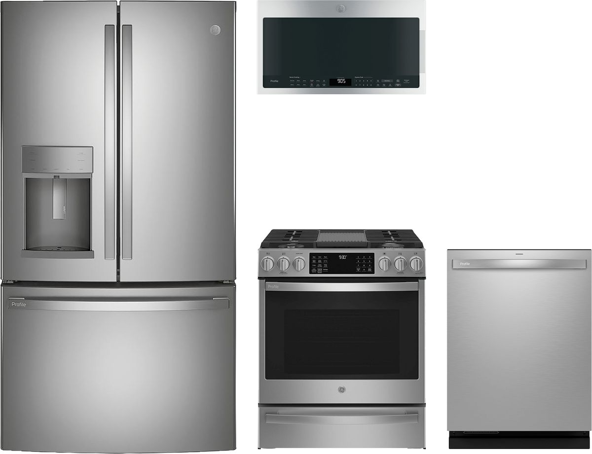 GE Profile™ 4 Piece Stainless Steel Kitchen Package with a French door refrigerator, slide-in gas range, built in dishwasher and over the range microwave.Read More