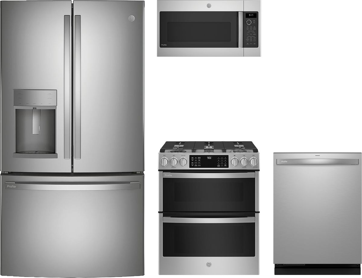 GE Profile™ 4 Piece Stainless Steel Kitchen Package with a French door refrigerator, slide-in gas range, built in dishwasher and over the range microwave.Read More