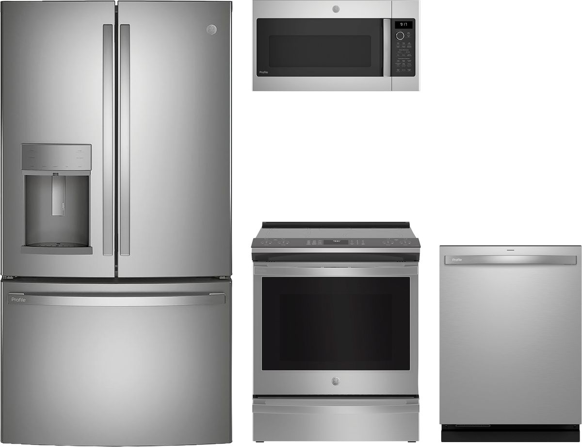 GE Profile™ 4 Piece Stainless Steel Kitchen Package with a French door refrigerator, slide-in induction range, built in dishwasher and over the range microwave.Read More