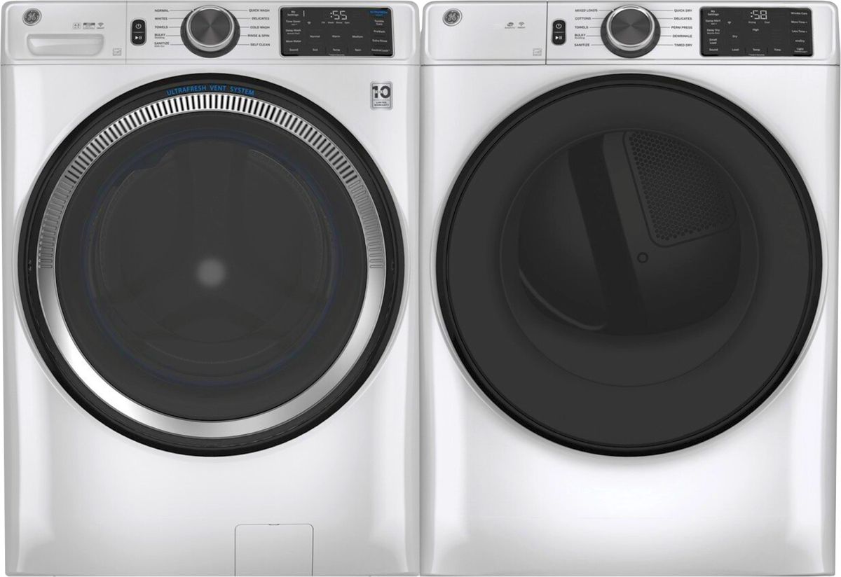 GE® White Front Load Laundry Pair with a 4.8 cu. ft. capacity front load washer and a 7.8 cu. ft. capacity front load electric dryer.Read More