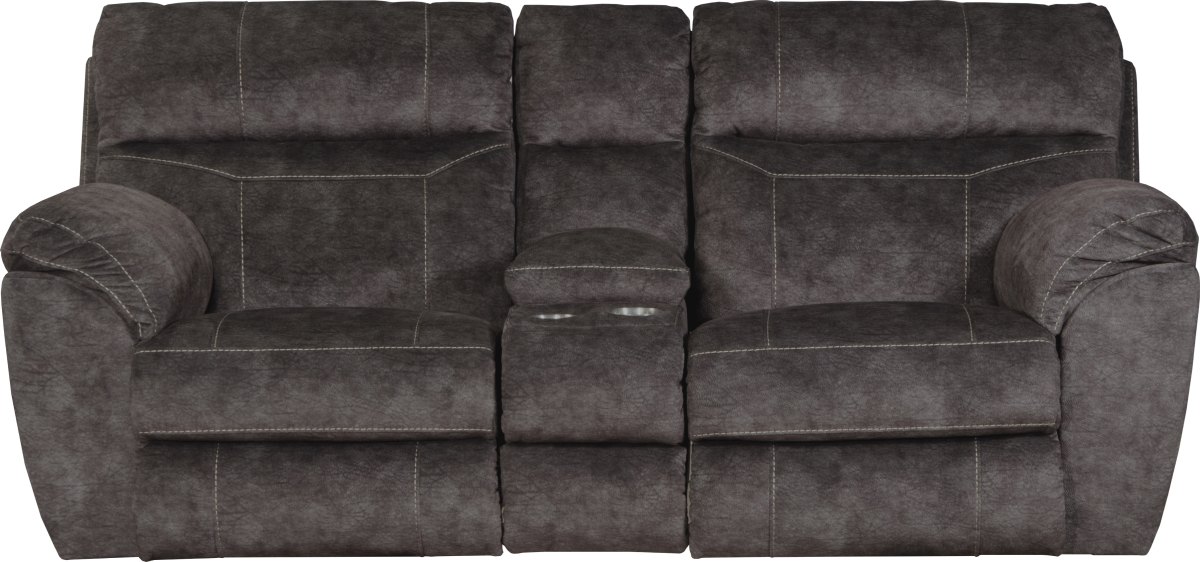 The Sedona Smoke Power Headrest Power Lay Flat Reclining Console Loveseat w/Storage & Cupholders features Power Recliner/Power Headrest and comfort control panel technology. The soft, thick, printed and embossed suede fabric paired with the Comfort Coil Seating featuring Comfor-Gel creates an extremely comfortable seat.