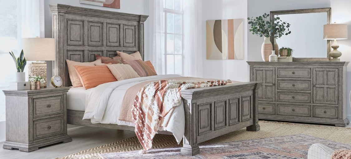 Featuring dovetail-crafted drawers, antique pewter knobs, felt-lined top drawers, and dust-proof cases, this 4-piece california king bedroom package includes a dresser with mirror, chest, and panel bed. It showcases graduated bead molding, full-extension side drawer guides, and a cohesive Graystone finish across all storage elements.Read More