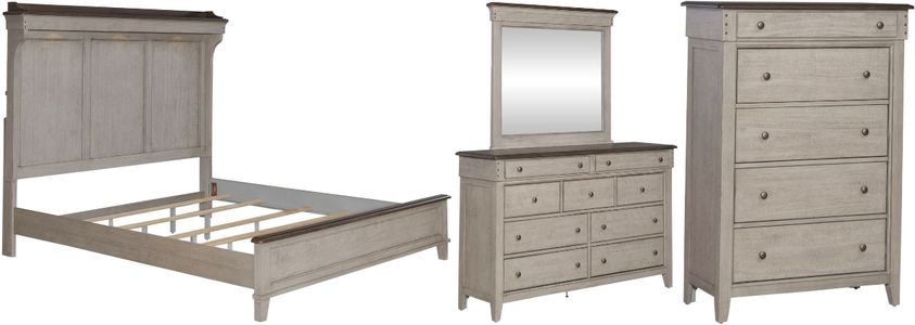 Create a relaxing retreat with the Ivy Hollow king mantle bed, dresser, mirror, and chest. Crafted of poplar solids with pine and alder veneers, this kit features a heavily distressed weathered linen finish with saw marks and dusty taupe tops, full extension drawers with premium felt lined top and cedar lined bottom drawers, offset top drawers to create dimension, framed end panels, pin nail head accents, and antique pewter knob hardware.Read More