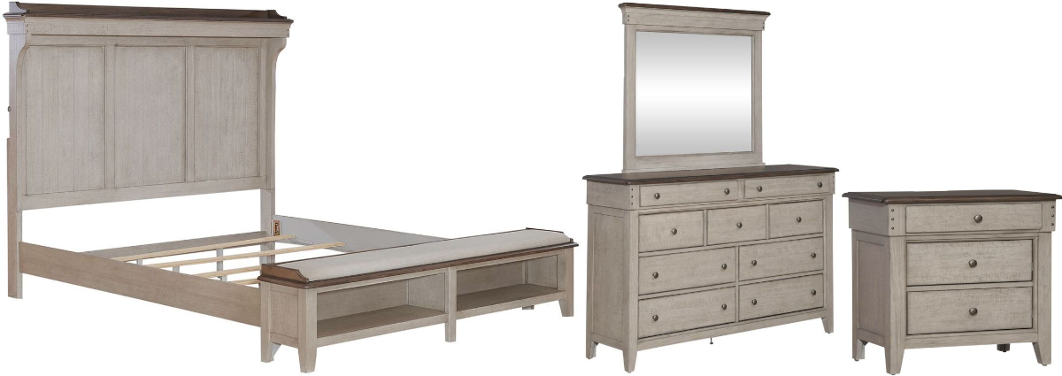 Create a relaxing retreat with the Ivy Hollow king mantle storage bed, dresser, mirror, and nightstand. Crafted of poplar solids with pine and alder veneers, this kit features a heavily distressed weathered linen finish with saw marks and dusty taupe tops, full extension drawers with premium felt lined top and cedar lined bottom drawers, offset top drawers to create dimension, framed end panels, pin nail head accents, and antique pewter knob hardware.Read More