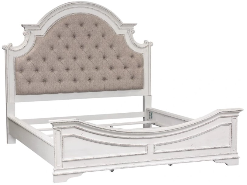 Accent your bedroom with the perfect blend of european traditional design, using this unique upholstered panel bed. Upholstered in tufted chenille, laced with tones of white, tan and brown threading, this bed constructed with poplar solids as well as oak and birch veneers, features an antiqued white finish accompanied by heavy chipping.Read More
