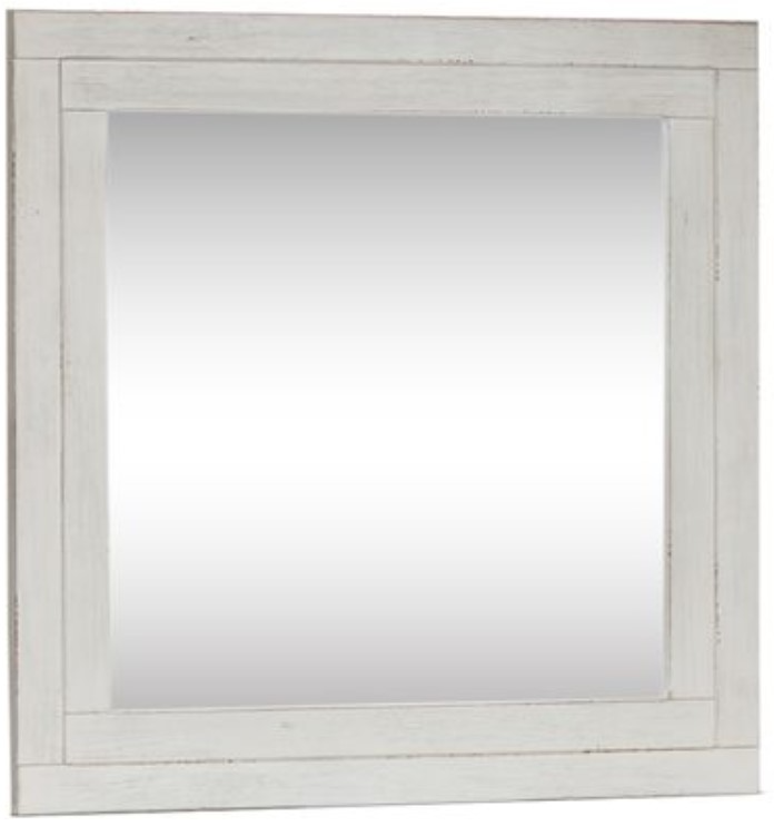 Complete your farmhouse look with this square mirror. The flea market white finish features heavy distressing that is accented by the high/low veneer pattern that encompasses the beveled mirror. This mirror is more than a piece of furniture, it is a statement piece.Read More