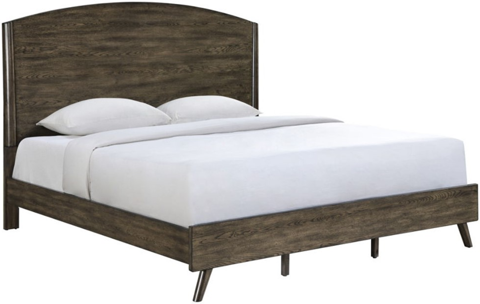 The low profile bed boasts an ample headboard with a curved top, echoing the rounded shaping of the entire collection.