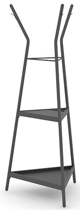 Entryway extraordinaire. Contain your clutter and chaos while adding a charming touch of style and design with this metal hall tree from the Boulevard Café collection. This hall tree with shelves features three arms with hanging hooks for convenient and easy access storage of items like coats, scarves, backpacks and more! A center storage section allows for handy placement of your yoga mat, umbrella, purse, keys and more. The lower open shelving unit of this metal coat tree is perfect for your shoes or a laptop bag. Finished on all sides for versatile placement, this black hall tree will look polished and complete from every angle. Ideal for the hallway, next to the door, or even in the mudroom, bring minimalist style and sleek design to any corner of your home. Finished in Black with a durable, powder coated metal frame, this standing coat tree will have your entryway looking neat and organized in no time!