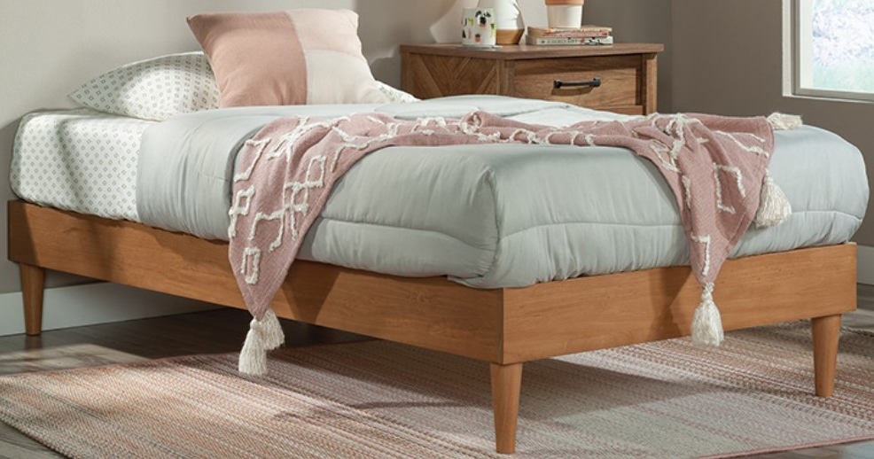 Upgrade the kid’s room from tween to teen with the refined look of the exotic woodgrain color. This twin size platform bed adds cozy style and simplistic beauty no matter where it rests. Catch a few mid-day zzz’s on this twin platform bed frame as a day bed in the spare bedroom. With a wood finish that complements our Sindoori Mango® finish, this platform twin bed gives a stylish and rustic alternative to other options with metal bed frames. We hope you like what you see. Sauder designers travel the world and bring back the best and latest in style, finish, and color trends. This inspiring world travel is evident in the cutting edge and innovative furniture solutions we offer to you!