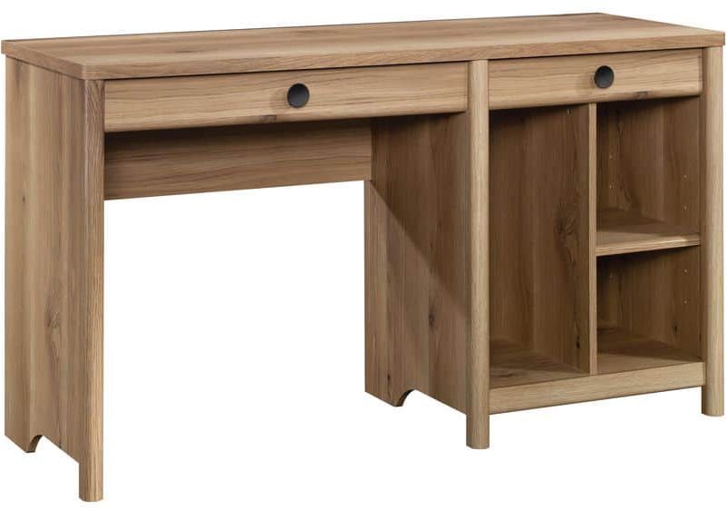This home office computer desk features two convenient storage drawers with metal runners and safety stops are useful for storing your planner, laptop, and other miscellaneous items. For kids, these drawers are perfect for coloring books, crayons, or other activity accessories. A dedicated storage space for a vertical CPU tower makes this computer desk with shelving ideal for the aspiring gamer: Beat the latest boss from the comfort of this computer desk with storage. An open storage cubby area with an adjustable shelf allows for versatile storage options. Finished in Timber Oak™, this home office desk with storage makes working from home, or writing your to-do list, stylish and practical.