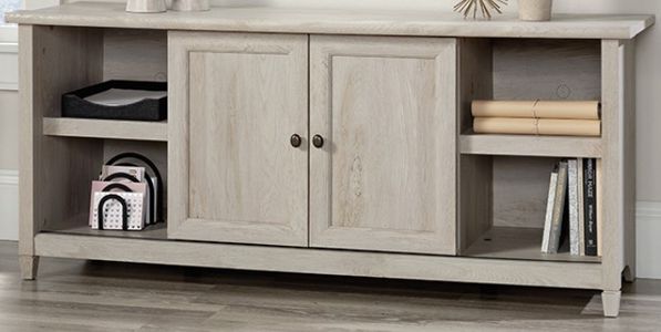 A simple TV credenza that bags a stylish punch. This credenza from the Edge Water® collection can fit the largest TVs without skimping on chic design. This credenza TV stand features three adjustable shelves for customizable storage options for books, audio/video equipment, and home décor. Quick and easy assembly with slide-on moldings means your TV stand with shelves will be ready to go in a snap. An enclosed back panel with cord access keeps your entertainment credenza free of unwanted cord clutter. Finished in a Chalked Chestnut®, this traditional TV credenza is the right fit for your living room, den, or spare room.