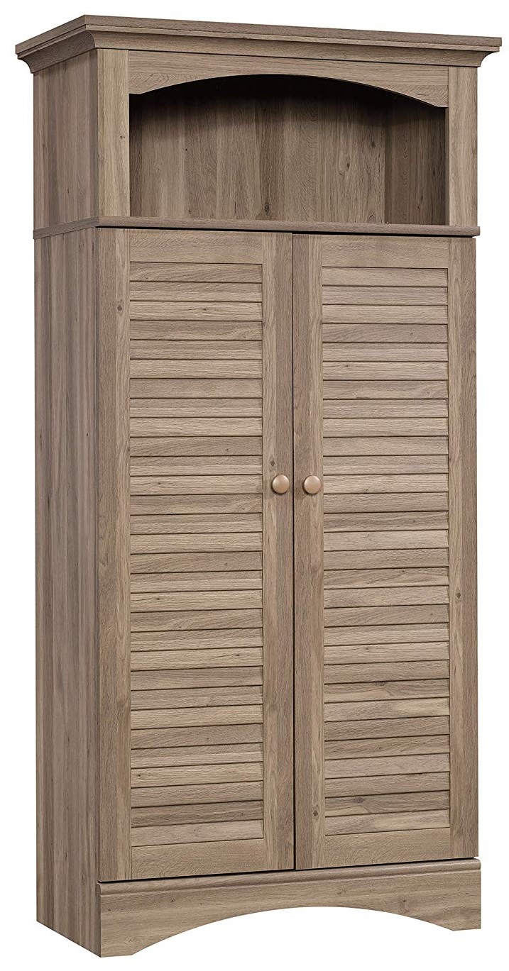 Stylish storage is something that every home needs. Create versatile storage options while adding a beautiful touch of cottage-inspired style with this two door storage cabinet from the Harbor View collection. Behind its louver detailed doors is a hidden storage area that will contain all your clutter and chaos. It includes one fixed shelf along with one adjustable shelf for flexible storage options for items of all shapes and sizes. Stow away and organize things like pantry items, board games, cleaning supplies and spare blankets too. It has a place for all your things! It also features open storage with a full upper shelf that is ideal for storing items like your collection of books or displaying picture frames and knick-knacks. This double door storage cabinet’s charming good looks and versatile design make it a perfect fit for bedroom or living room. Finished in Salt Oak and detailed with solid wood knobs, this handsome storage cabinet with doors is just what your home is missing.