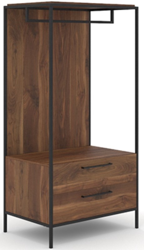 This open wardrobe with drawers features a hanging storage system with garment rod, ideal for storing clothing items like coats, blouses, skirts and so much more. This wood and metal armoire also includes two storage drawers that open and close on metal runners and safety stops. These drawers are perfect for stacking of denim, linens, sweatshirts, and more. This wardrobe with drawers features a durable, powder coated metal frame for stability and industrial inspired design. Finished in Grand Walnut®, this wardrobe rack is the ideal clothing storage furniture for you!