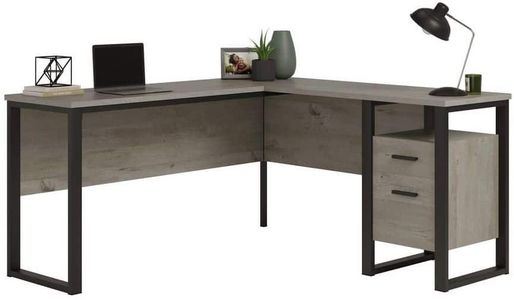 This L-shaped home office desk also has plenty of space for home décor items like an accent lamp and framed photos. The small storage drawer opens and closes on smooth metal runners for easy-access storage of miscellaneous items like notecards, sticky notes, and your headphones. Plus, the lower drawer with full extension slides holds letter-size hanging files, keeping your most important documents organized and easy to find. This L-shaped desk with drawers also features an open shelf for papers and supplies. A home office desk featuring a black, powder-coated metal frame and a lightweight 1” construction top adds style and durability. Finished on all sides for versatile placement, this L-shaped desk with storage will look polished from every angle. A Mystic Oak® finish is the cool-toned touch that makes this L-desk stand out from the others.