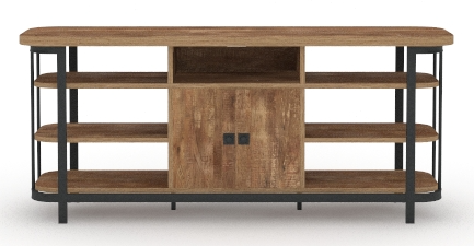 Add a touch of rustic-inspired style and design to your living room with this TV credenza from the Station House® collection. This wood and metal credenza accommodates up to a 65” TV, making it the perfect spot to gather around with friends to watch the big game or play hours of video games. No need to worry about lack of space—this TV credenza with storage features six open shelves along with a single cubbyhole storage area. These shelves are ideal for storing and displaying a variety of items like your favorite books, potted greenery, and framed photos of your family. Plus, the credenza has a hidden storage area behind its doors that includes an adjustable shelf that can move to different heights to store items of all shapes and sizes. Attractive from every angle, this media credenza is finished on all sides for versatile placement. Finished in Etched Oak™ and detailed with a textured, powder-coated metal frame, this industrial credenza is sure to stand out in your home.
