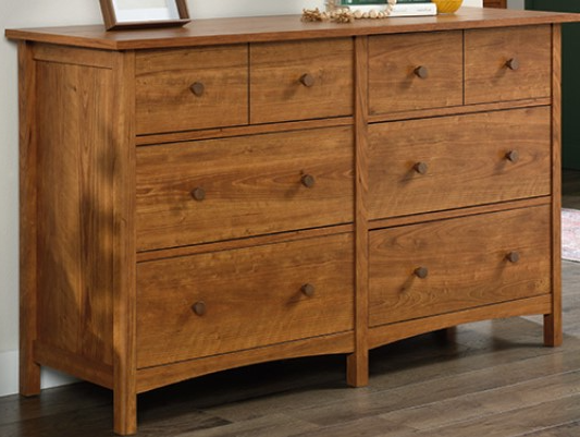 Upgrade the look of your bedroom while adding versatile storage options with this 6-drawer dresser from the Union Plain® collection. The lower four drawers of this shaker style dresser are extra deep, allowing room for your bulkiest items. This double dresser’s spacious top surface provides you with ample amount of room for display of your favorite home décor items – an accent lamp, decorative candles, a mirror, or photos of your family and friends. The rustic charm and sleek design of this dresser with drawers make it a perfect fit for your bedroom. A tip restraint safety strap is included for an extra security of your dresser. Finished in Prairie Cherry™, this chest of drawers is sure to give your bedroom the instant country style makeover that it has been craving.