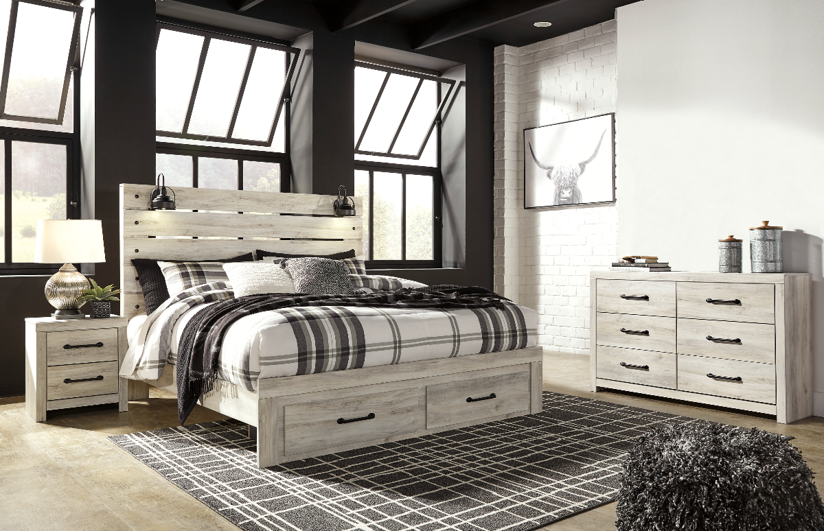 This Cambeck bedroom set offers a blend of rustic charm and modern functionality. This set includes a panel bed, a six-drawer dresser, and a matching mirror, all featuring a whitewash finish that highlights the wood grain, creating a cozy and inviting bedroom atmosphere.Read More