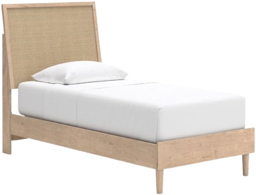 Clean-lined and contemporary—but far from stark—this twin panel bed is a fresh style awakening. Pairing a light finish with replicated oak grain and textured beige details that replicate the look of cane, its mixed materials bring a naturally versatile vibe to your bedroom. Talk about style with added dimension.Read More