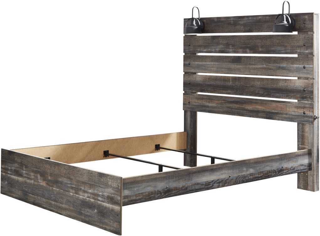 When merged in just the right way, rustic and industrial styles can make one happy marriage. Case in point: this queen platform bed. A refined take on barn board beauty, its complex, replicated wood grain showcases hints of burnt orange and teal tones for a sense of weatherworn authenticity. Love to read in bed? You’re sure to find the pair of retro-chic light sconces and USB plug-ins on the open-slat style headboard such a bright idea. Mattress available, sold separately. Assembly required for this product.Read More