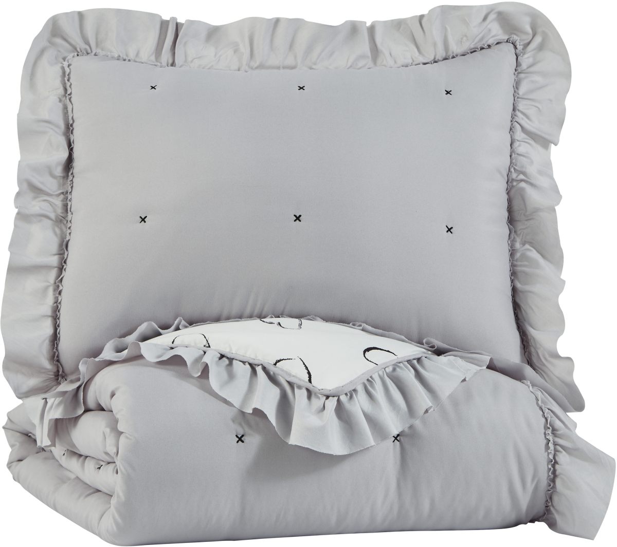 2-Piece comforter set - includes comforter and 1 sham. Solid in gray with flange border. Reverses to heart design in black and white. Polyester microfiber cover with polyester filling. Machine washable.Read More