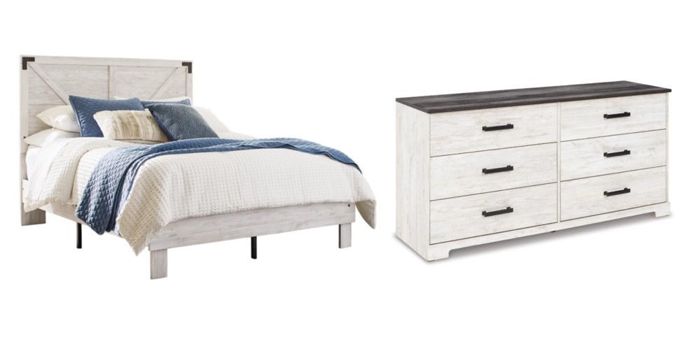 Includes panel platform bed (headboard and platform bed) and 6-drawer dresser