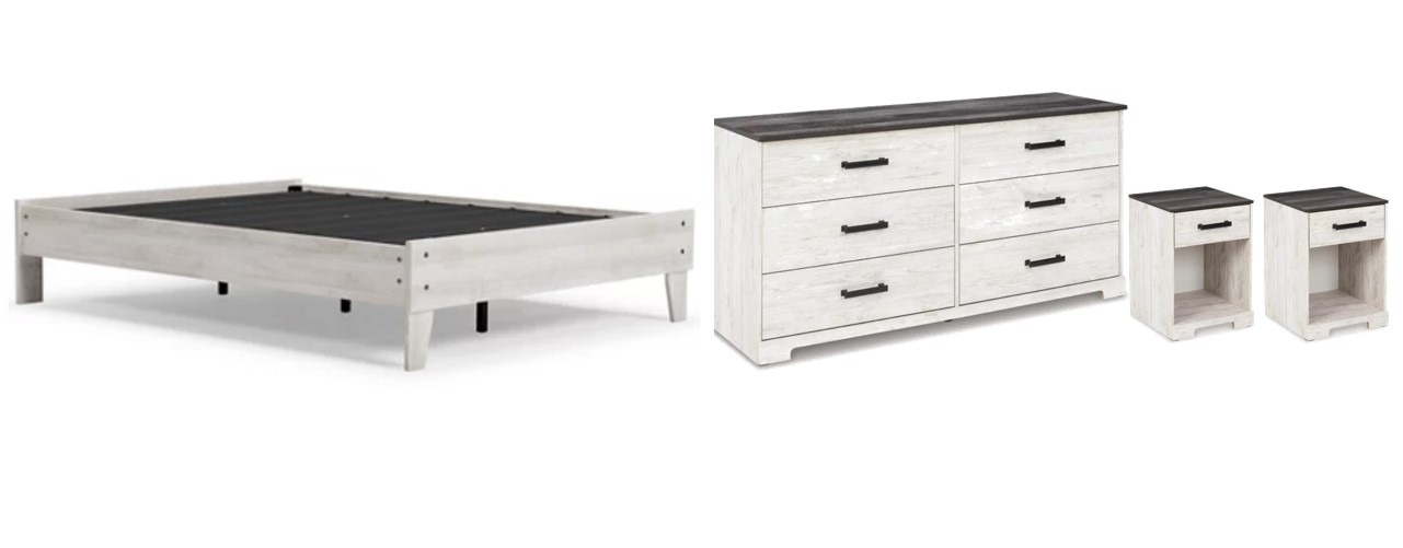 Includes full platform bed (does not include headboard), 6-drawer dresser and two 1-drawer nightstands
