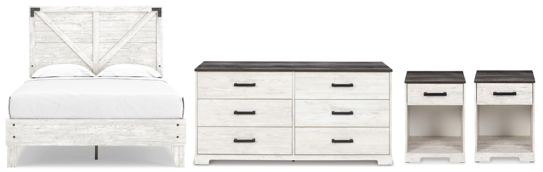 Includes panel platform bed (headboard and platform bed), 6-drawer dresser, and two 1-drawer nightstands