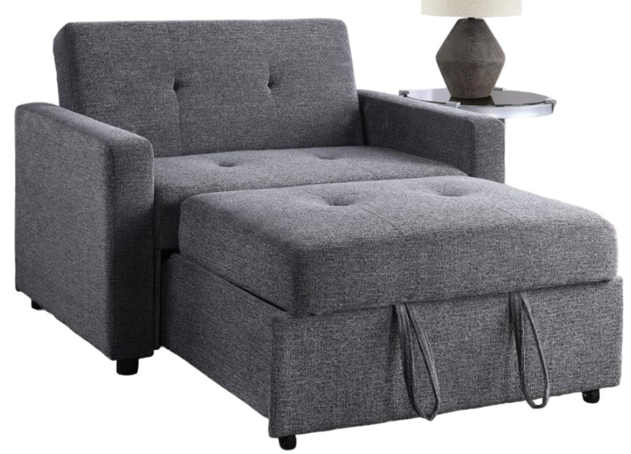 The chair features 7-inch welted box seat cushions and soft gray chenille fabric, providing both comfort and elegance. Easily extend it into a chaise, or drop the back to create a sleep surface perfect for naps or guests. The Noah Convertible Sleeper Chair adapts to your every need.