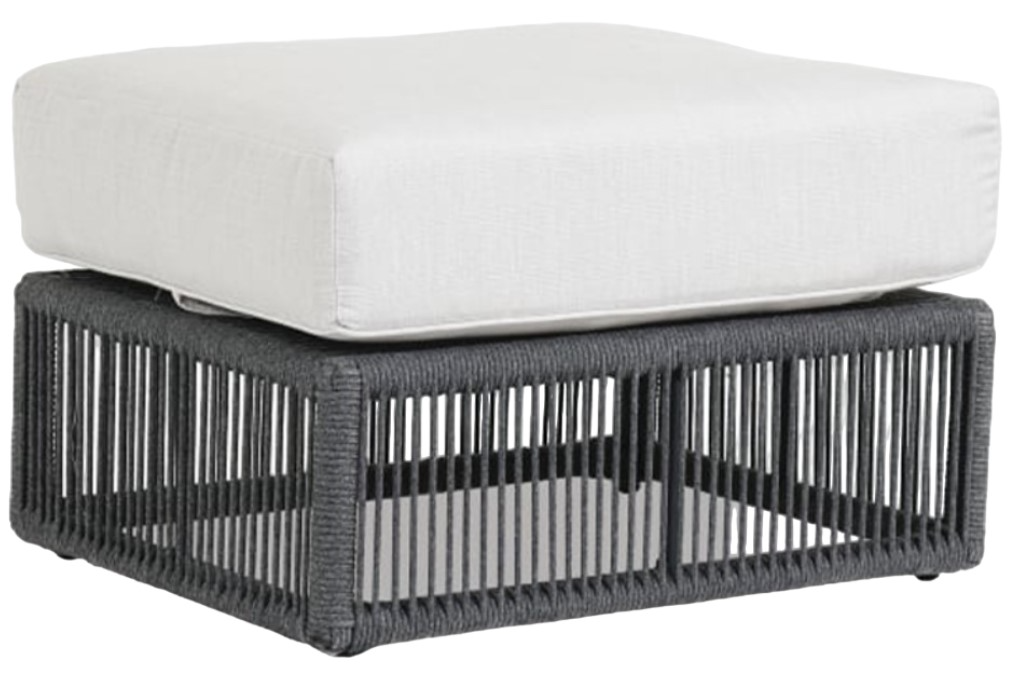 The Milano Ottoman is rendered with a box aluminum frame, expertly hand-wrapped by artisans with premium all-weather olefin rope in a charcoal-grey. Stocked with a plush 6" cushion for supreme comfort.Read More